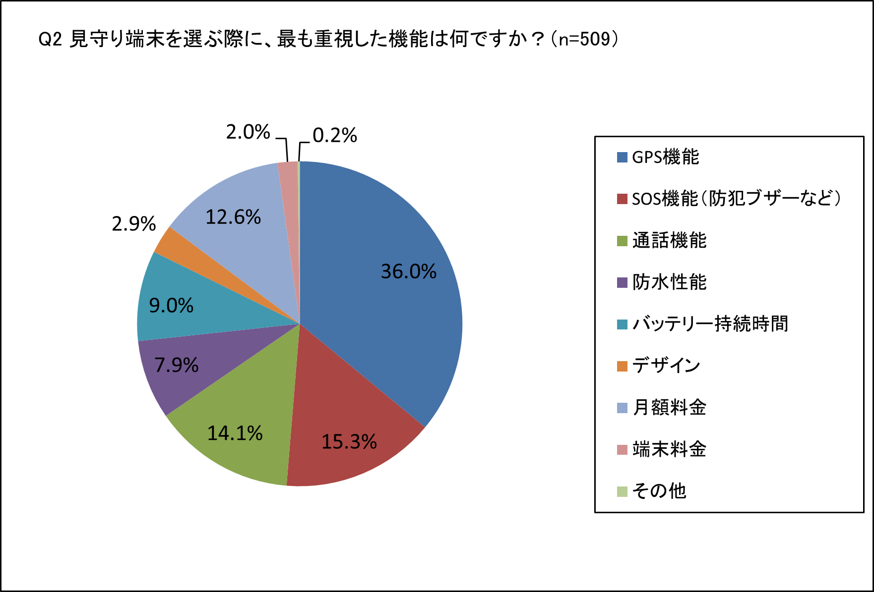 見守り端末を選ぶ際に最も重視した機能を聞くと、GPS機能(36.0%)、次いで「SOS機能(防犯ブザーなど)」(15.3%)、「通話機能」(14.1%)と、見守りや防犯に特化した機能を重視する傾向。