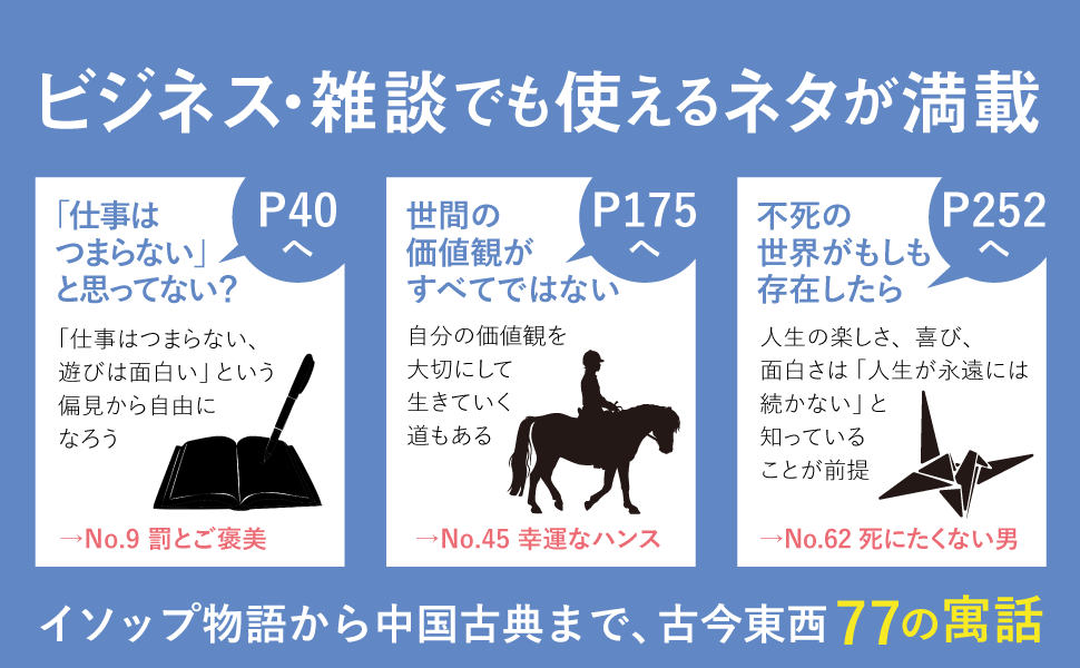 本書には、私たちの抱く多様な「人生の悩み」へのヒントになる77の寓話と、その解説が載っています。