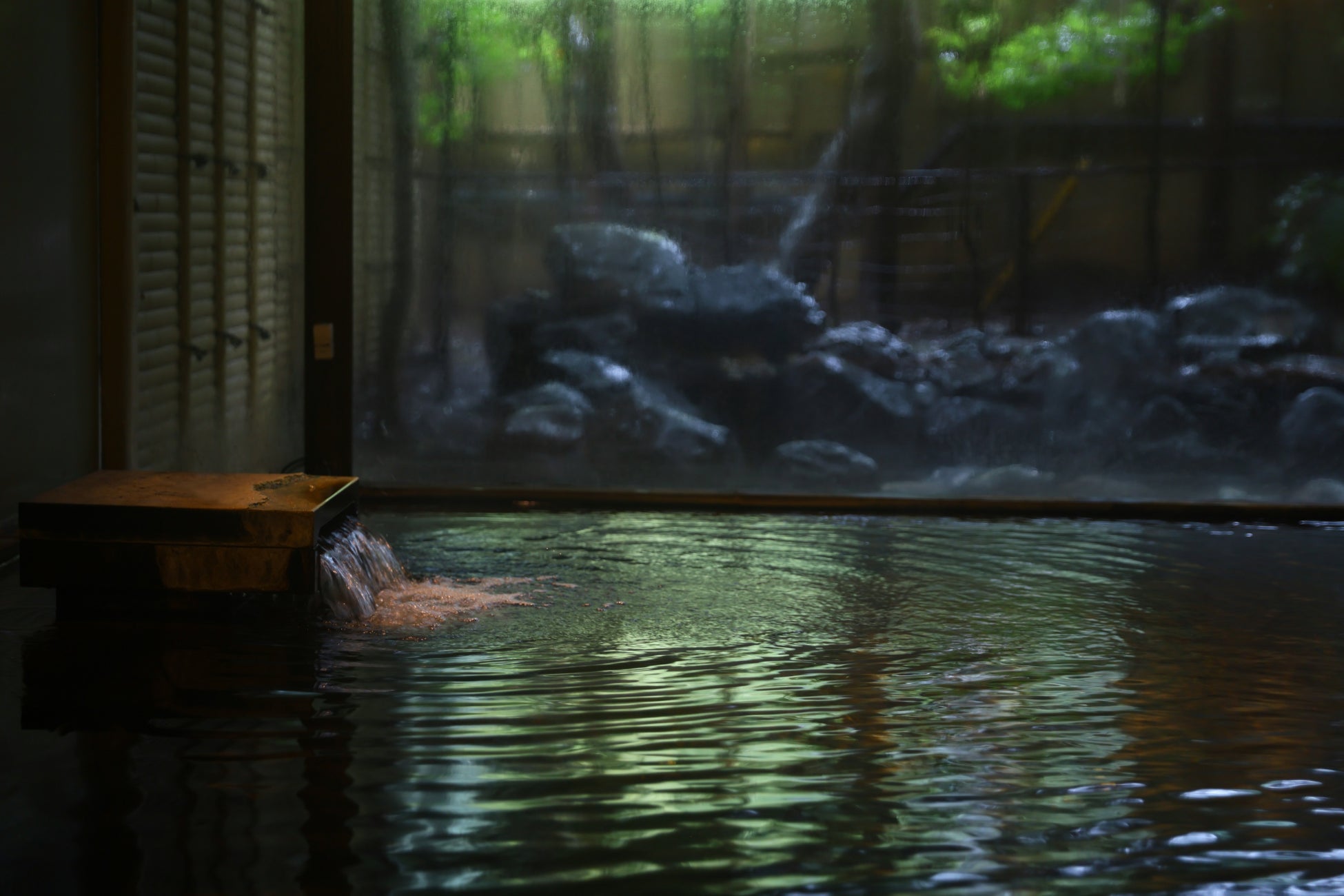 大浴場は黒御影石に縁取られた伊豆石の広々とした浴槽があり、大きな全面ガラスの窓から庭園を望みます。