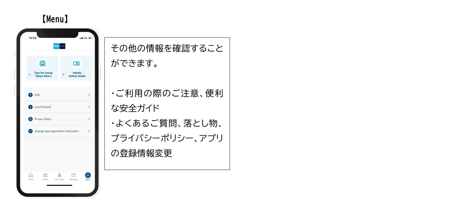 「Tokyo Metro For Tourists」は東京観光をされる訪日外国人旅行者向けに英語・韓国語・中国語(簡体字・繁体字)・タイ語・フランス語・スペイン語の6言語に対応している東京メトロ公式の無料アプリです※。お困りごとを解決する情報が一か所にまとまっており、役立つ観光情報が手早く見つかる構成としています。