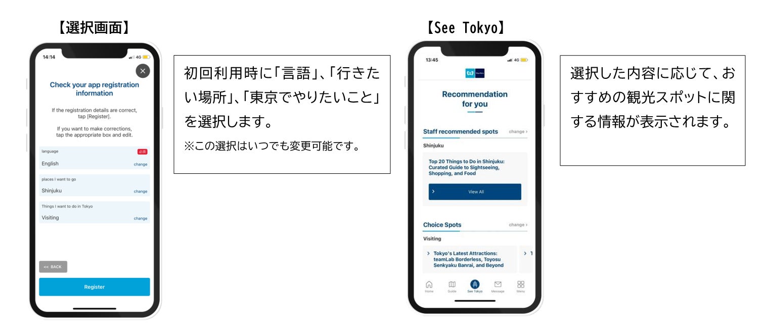 本アプリでは、利用者が登録する「行きたい場所」や「東京でやりたいこと」に応じておすすめの観光スポットが表示されるため、この情報を基に、東京観光をより楽しんでいただくことができます。東京メトロを利用した東京観光には、このアプリをぜひご活用ください。