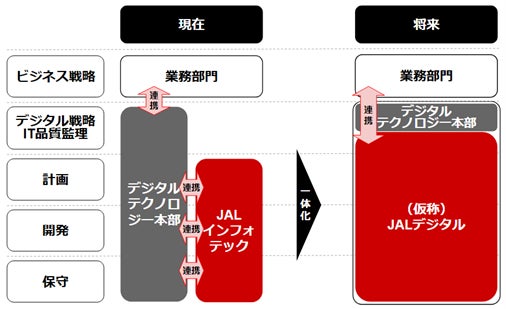 JALグループの全事業の基盤であるITシステムの安定稼働を堅持しつつ、DXをさらに加速させ、JALグループの持続的な成長を実現するために、JALのデジタルテクノロジー本部とJITの組織体制を一体化することが最適であると判断しました。