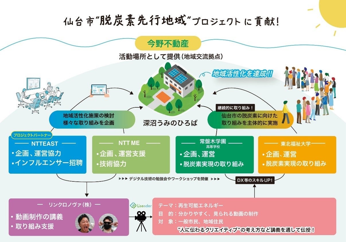 取組み3年目となる今年は、株式会社リンクロノヴァと株式会社リセンダー(代表取締役:長野 雅樹、以下、リンクロノヴァ、リセンダー)の代表取締役であり、仙台市を中心に活動するインフルエンサー『ながの社長』とコラボレーションし、再生可能エネルギーについて学べる動画の制作等を通し、宮城県仙台市が国から選定された「脱炭素先行地域」計画の推進に貢献してまいります。