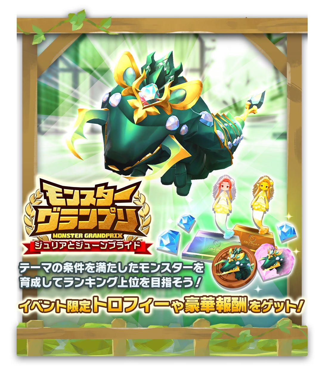 「モンスターグランプリ『ジュリアとジューンブライド』」を開催します。前半、後半で3つずつ用意されたテーマに沿ってモンスターを育成完了し、「いいね(総合力を元にしたポイント)」でランキングを競います。月の前半、後半を合算した総合ランキングにより獲得できる専用トロフィーには総合ランキングの順位が保存され、いつでも確認することができます。イベントの詳細はゲーム内にてご確認ください。