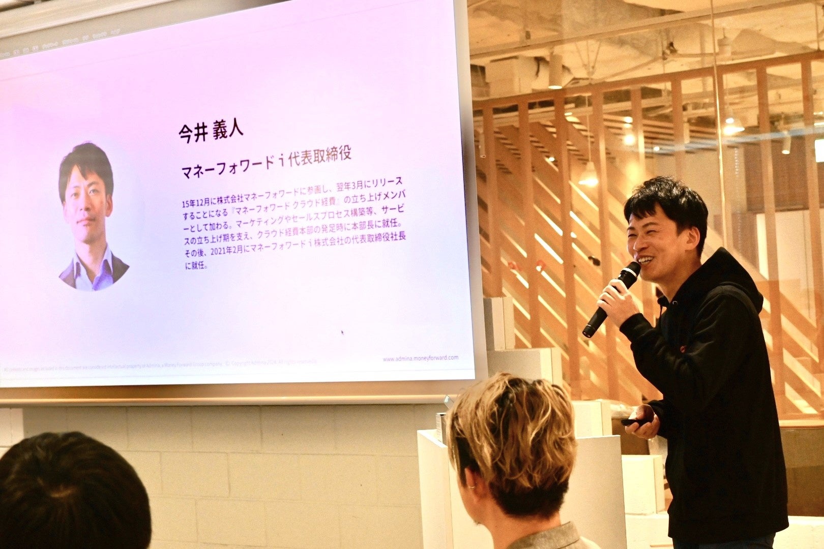 当日は13社、18名の『マネーフォワード Admina』ユーザーがマネーフォワード本社に集まりました。はじめに、代表の今井より事業の近況説明を行い、続いてCPOの村上より、2023年に提供を開始した機能や、2024年夏に開発予定の「ワークフロー機能」を紹介しました。