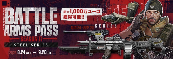 さらにアイテムモールで「BATTLE ARMS PASS」または「LEGENDARY ARMS PASS」を交換すると、ロックされた報酬が解放され、新登場のアイテム「STEEL SERIES」のキャラクター、メイン銃器、サブ武器、近接武器、投擲武器の入手が可能となります。さらに今回から各対象ミッションをクリア時に獲得できるポイントが2倍となっており、今までよりもさらに報酬を獲得しやすくなっておりますので是非この機会にご参加ください。