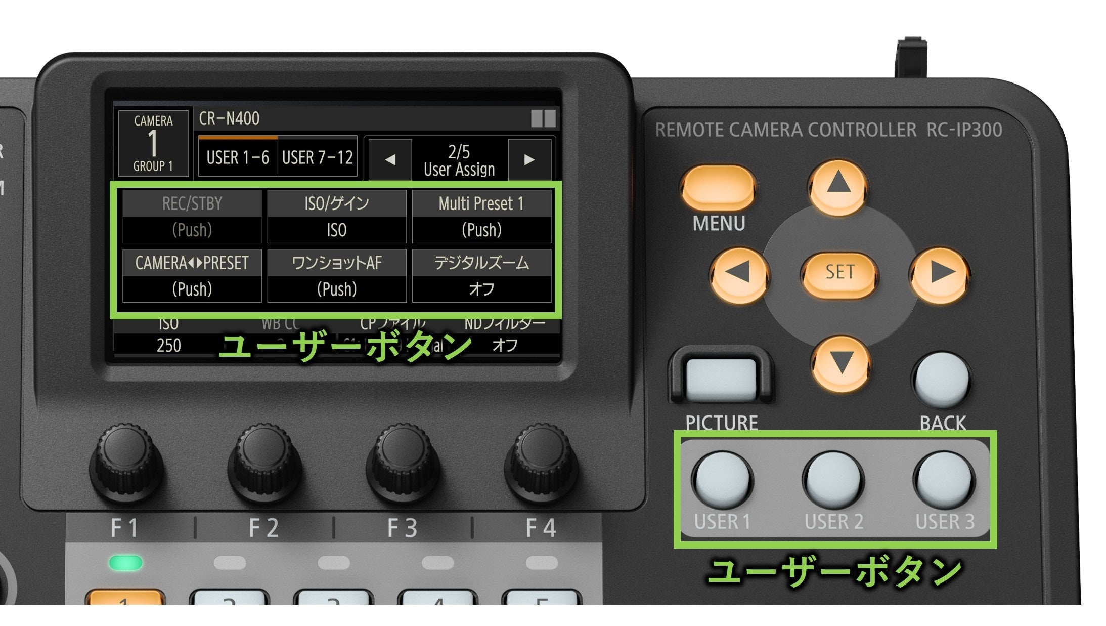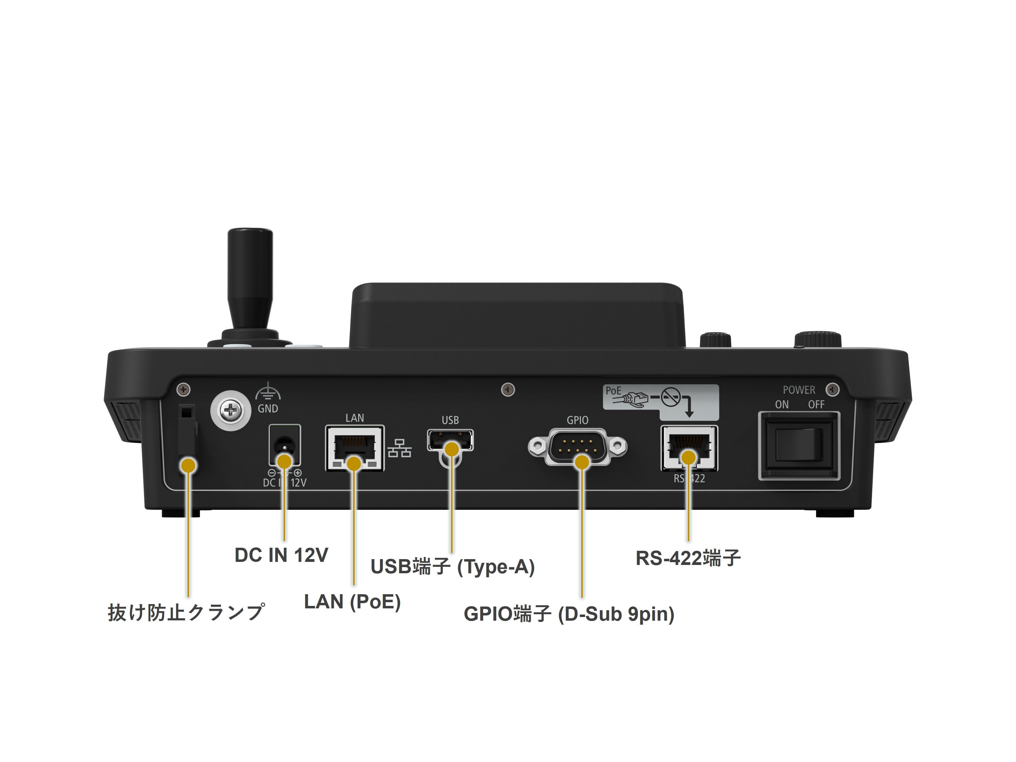 本体の大きさは約255mm(幅)×約180mm(奥行き)×約93mm(高さ)(※2)、質量は約1.3kgと、小型・軽量ボディーを実現しました。PoE(※3)に対応し、ケーブル1本で給電・制御ができるため、スタジオのバックヤードのような機材が多く設置された、限られたスペースでも柔軟な設置が可能です。また、直感的に操作ができるボタンやダイヤルを多く搭載しているほか、それらを操作の種類ごとに分けて配置しており、リモートカメラのパン、チルト、ズーム操作やフォーカス、絞りなどの制御が容易です。さらに、ユーザーが使用頻度の高い機能を独自に割り当てられる「ユーザーボタン」を備えており、簡単なボタン操作で素早く機能を実行することができます。