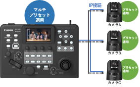 PCを使用せずに“RC-IP300”で簡単にリモートカメラの初期設定を行うことができます。また、各カメラに設定したプリセット番号を組み合わせて実行できるマルチプリセット機能により、一斉に複数台のカメラをあらかじめ決めた画角に動かすことが可能です。さらに、「アドオンアプリケーションズシステム」との連携が可能で、「自動追尾アプリケーション」と「自動ループアプリケーション」(ともに2023年4月発売)に対応しています。