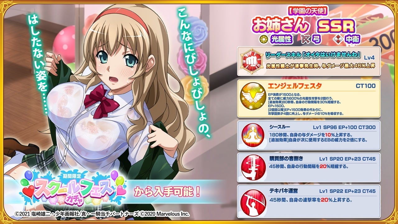 本日から始まる「スクールフェスガチャVol.1」では、新たに「【学園の天使】お姉さん」(CV:堀江由衣)」が登場。