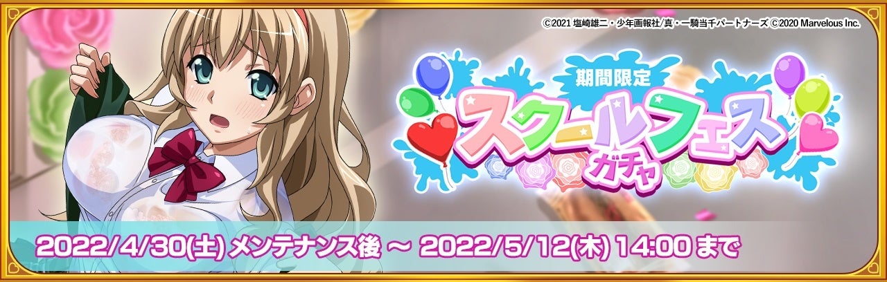 株式会社マーベラス(代表取締役社長 許田周一/所在地:東京都品川区)は、原作が20周年を迎えた人気シリーズ「一騎当千」のAndroid/iOS向けゲームアプリ『一騎当千エクストラバースト』で、2022年4月30日(土)より、新イベント「ずぶ濡れ!?ハプニング学園祭」を開始したことをお知らせいたします。