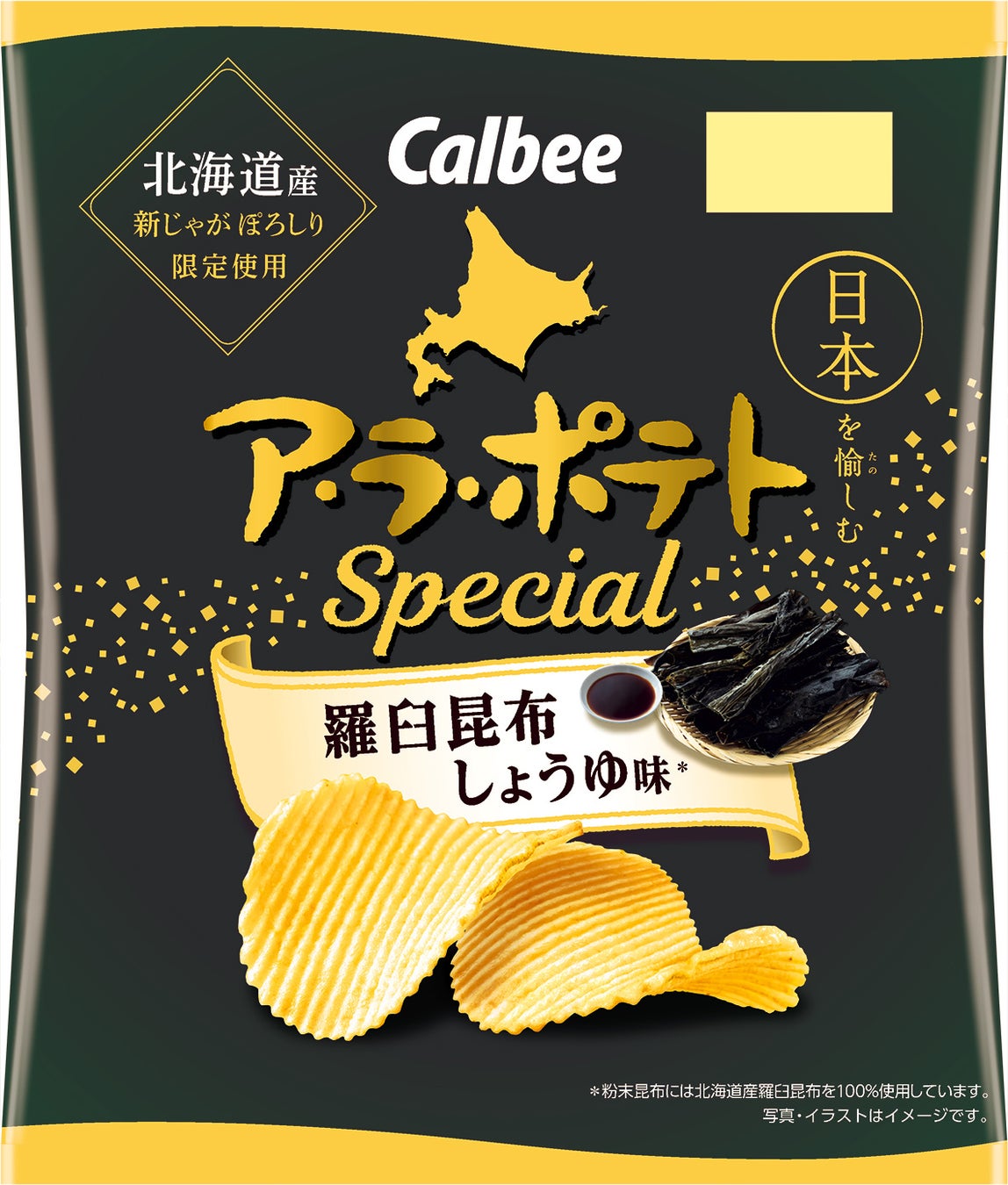 ●『ア・ラ・ポテト 羅臼昆布しょうゆ味』は、北海道産羅臼昆布を使用。羅臼昆布と醤油にうま味が引き立つ帆立・しいたけを加え、じっくり楽しめる味付けに仕上げた「ア・ラ・ポテト」です。ザクッと厚切りカットで、「ぽろしり」のおいしさを活かしました。この商品は、日本各地で大切に育まれた食文化や素材の魅力をお菓子を通じて発信していく「日本を愉しむ」プロジェクトの一環で、誕生した商品です。