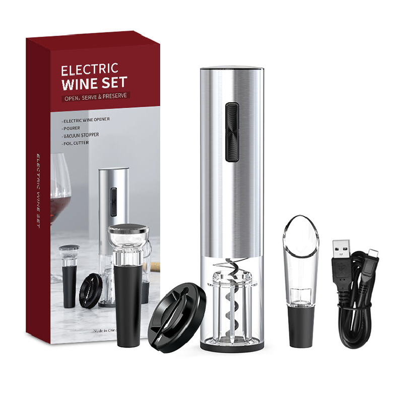 「GinSilverset」は、ワインボトルオープナー・フォイルカッター・ワインポアラー・真空型ワインストッパーの4点セットです。