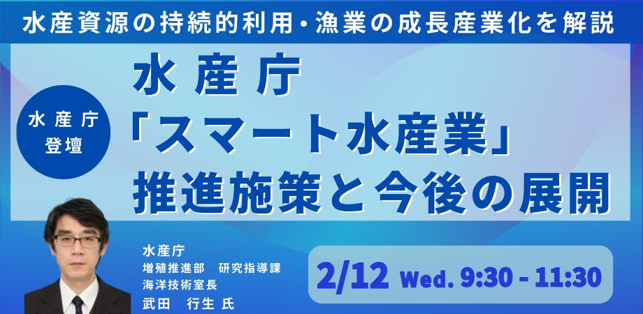 JPI(日本計画研究所)は、水産庁 増殖推進部 研究指導課 海洋技術室長 武田 行生 氏を招聘し、「スマート水産業」推進施策と今後の展開について詳説いただくセミナーを開催します。