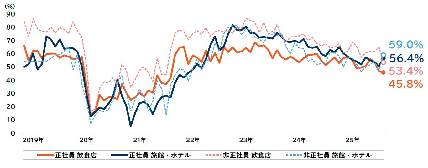 非正社員では、「旅館・ホテル」が2023年11月以来、23カ月ぶりにトップとなったが、全業種で6割を下回った。前年同月でトップの「飲食店」も改善し、DX・スポットワークの活用が生産性向上につながっているとみられる。一方で、派遣人材による活発な人員確保の動きから「人材派遣・紹介」は高水準で推移しており、「各種商品小売」とともに前年同月を上回った。