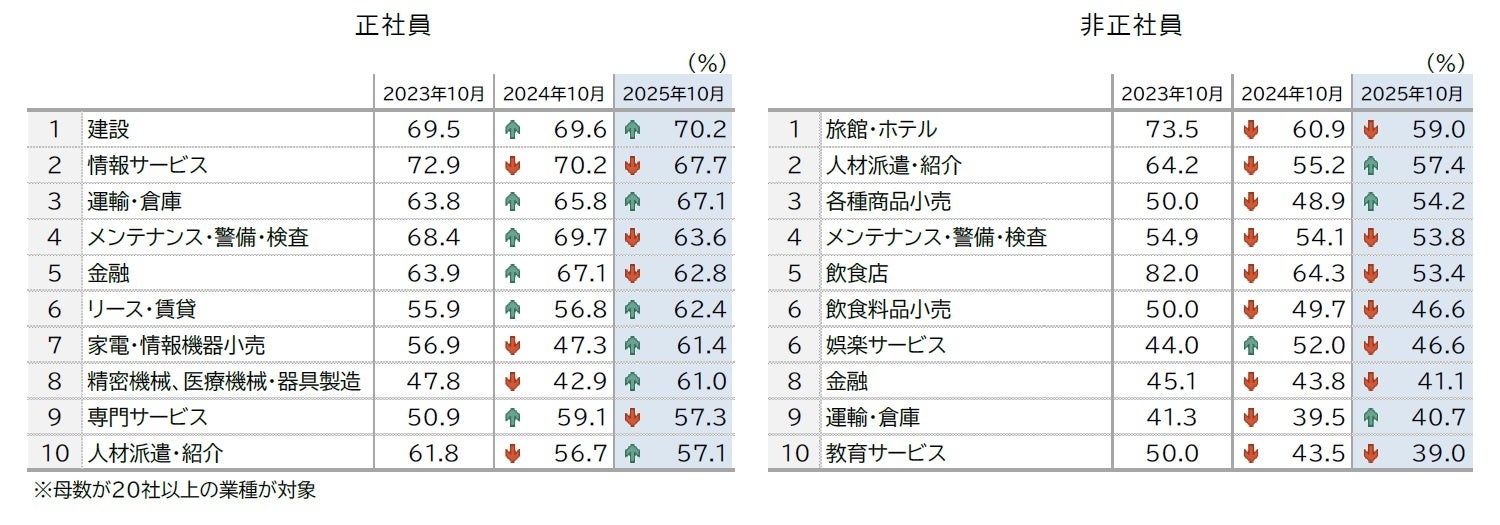 また、ドライバー不足が深刻な「運輸・倉庫」(67.1%、同+1.3pt)や、低賃金や不規則な労働環境といった要因から慢性的に人手が不足している「メンテナンス・警備・検査」(63.6%、同-6.1pt)など、51業種中8業種が6割を上回る結果となった。
