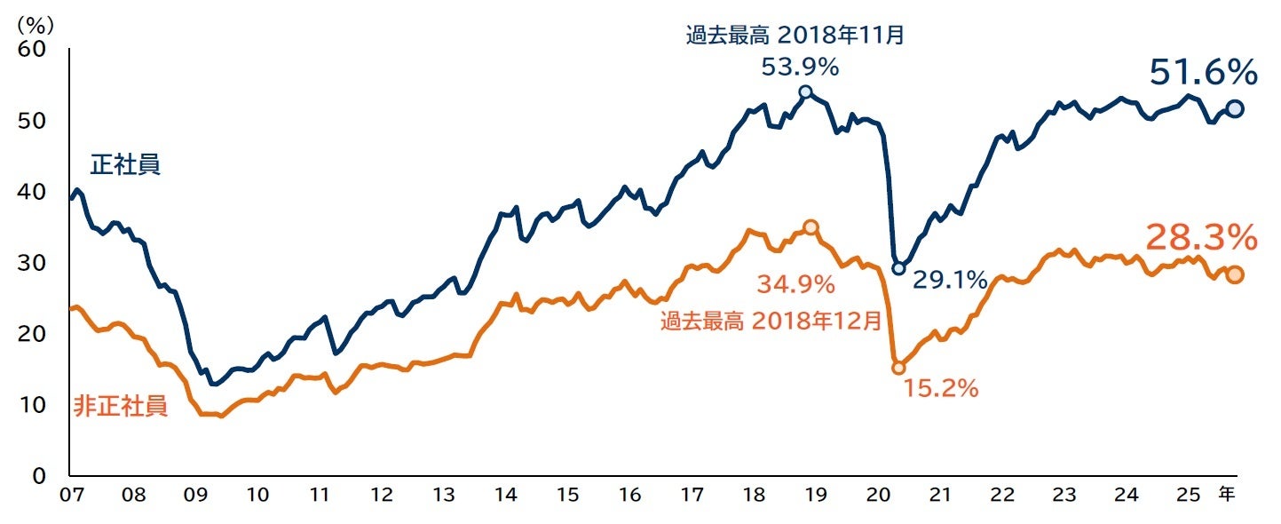 2025年10月時点で、人手不足を感じている企業の割合は正社員で51.6%、非正社員では28.3%だった。どちらも前年同月よりわずかながら改善し、正社員に比べて非正社員に、より改善傾向がみられる。