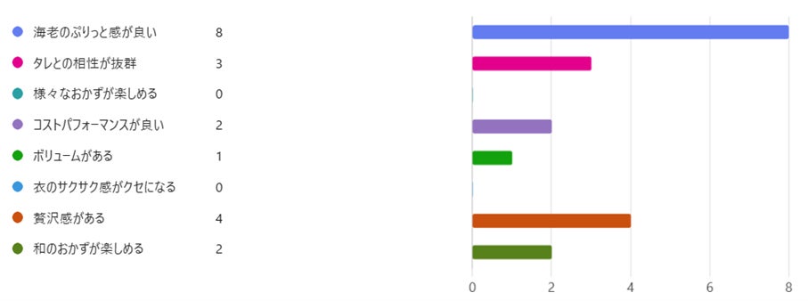 最も多くの票を集めたのは『海老のぷりっと感が良い』というポイントでした。以下2位は『贅沢感がある』、『タレとの相性が抜群』でした。