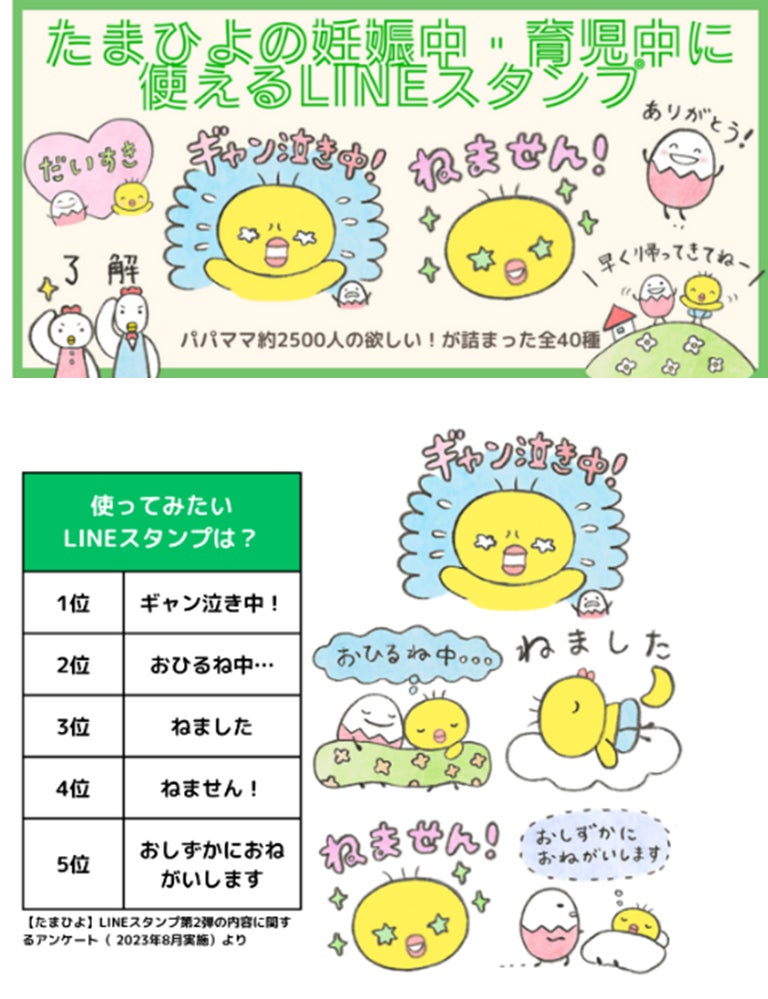 たまひよのLINEスタンプ第2弾は、パパ・ママ約2500人のアンケートから誕生した、妊娠中・育児中に使えるLINEスタンプ♪「ギャン泣き中!」「ねません!」など全40種。
