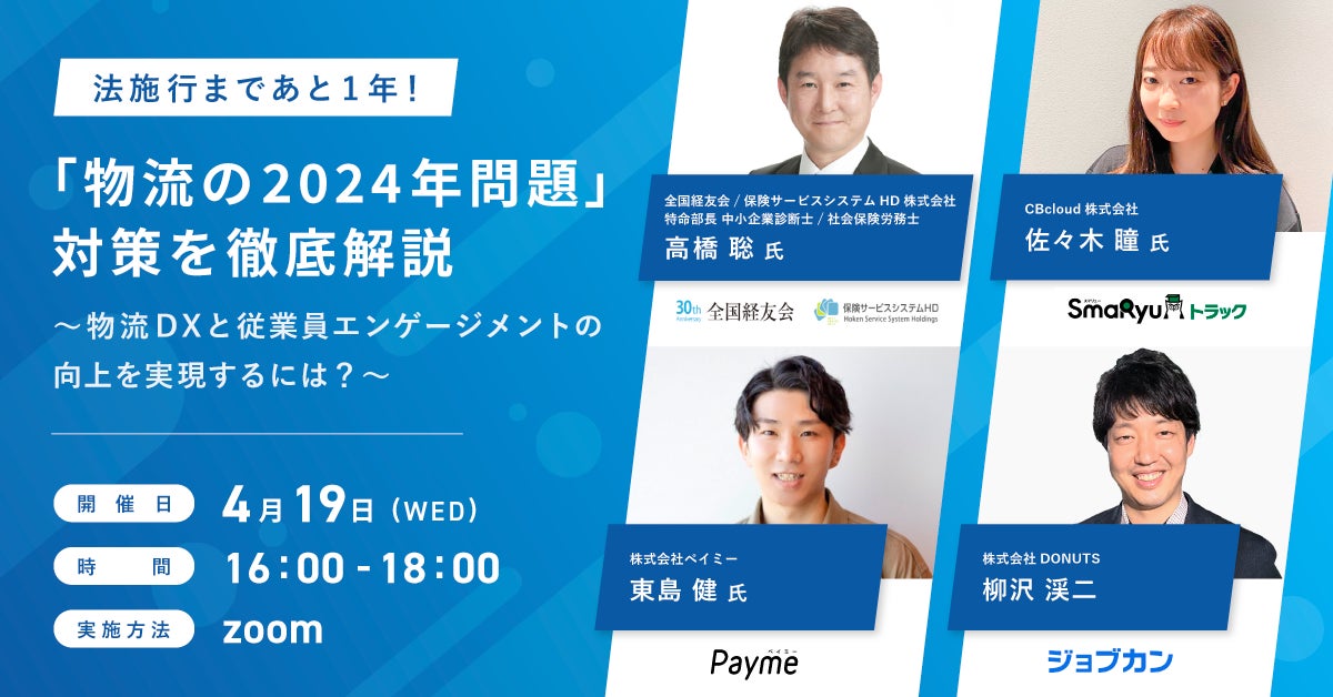ジョブカンは、「2024年問題」に直面した物流業界の課題解決をサポートするため、保険サービスシステムHD・ペイミー・CBcloudとの共催セミナー【「物流の2024年問題」対策を徹底解説】を、4月19日(水)にオンラインにて開催することを決定いたしました。