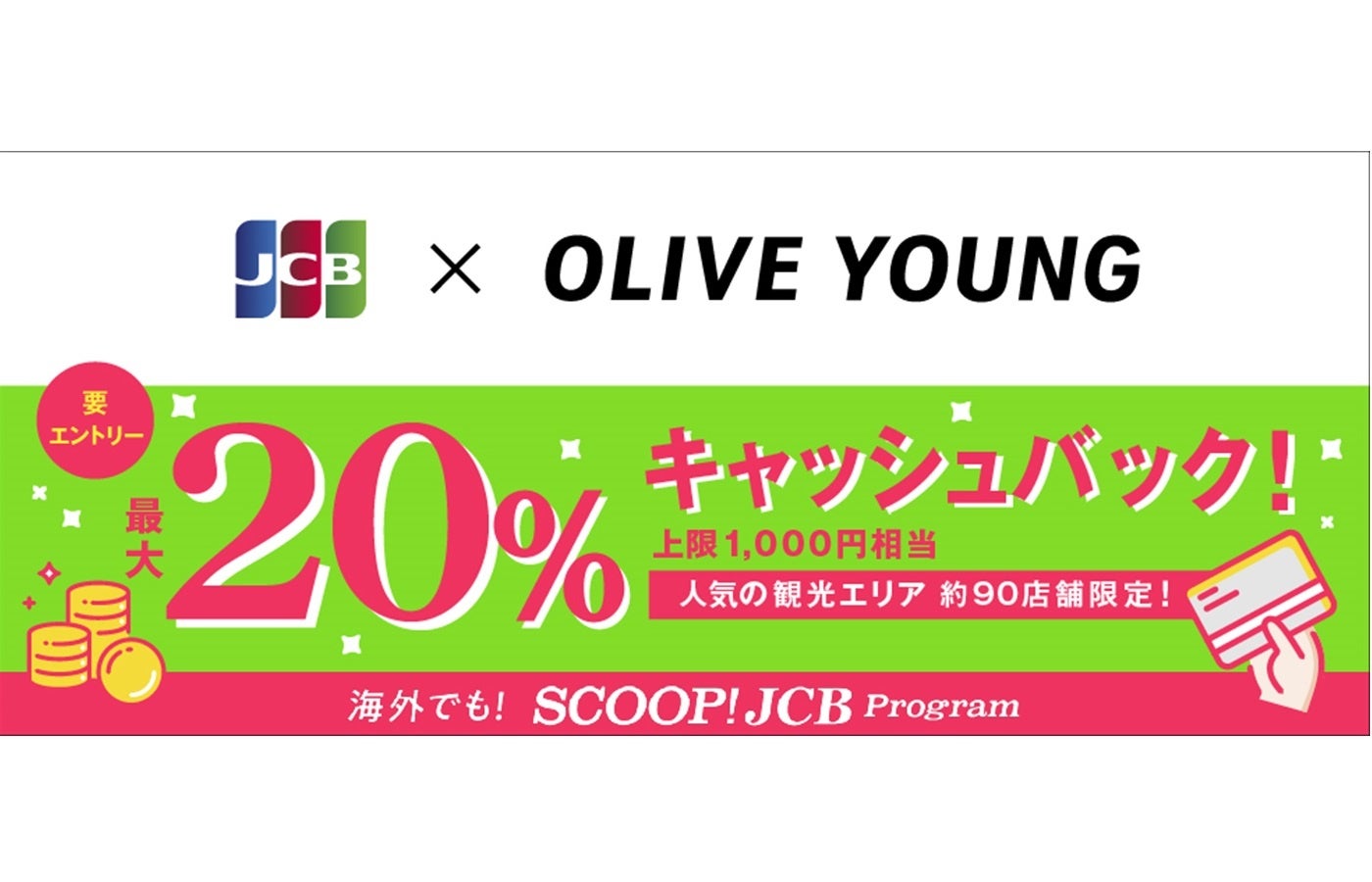 株式会社ジェーシービー(本社:東京都港区、代表取締役兼執行役員社長:二重 孝好、以下:JCB)は、2025年6月1日(日)から11月30日(日)まで、「韓国のオリーブヤングでJCBを利用すると20%キャッシュバック!」キャンペーンを実施します。JCBでは、「SCOOP! JCB Program」と題し、様々なキャンペーンや優待サービスをJCBブランド会員様にお届けしております。