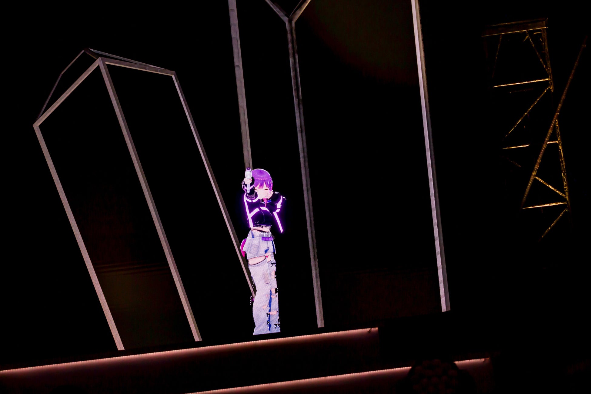 嘆息を漏らす間も与えないまま、「Purple Disease」に入った瞬間には、新衣装がお披露目された。この衣装は、本ライブのキービジュアルのデザインに、ショート丈のジャケットをオンしたもの。ダメージジーンズから覗く内腿のタトゥーがセクシーで、短めにカットされた髪も相まってパンク&シックな印象だ。リズミカルなビートを乗りこなし、トワ自身が音楽を満喫している様子が伝わってくる。