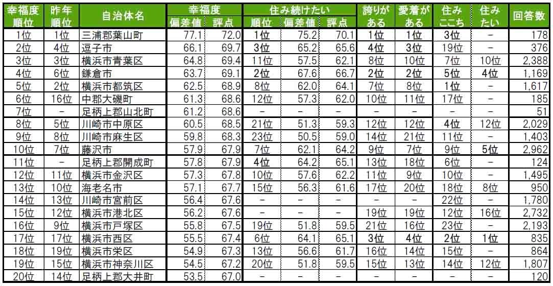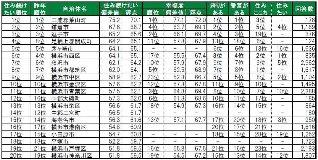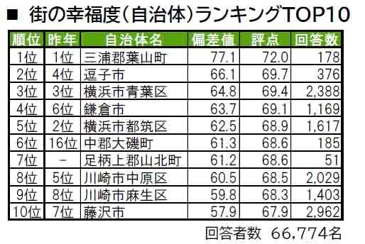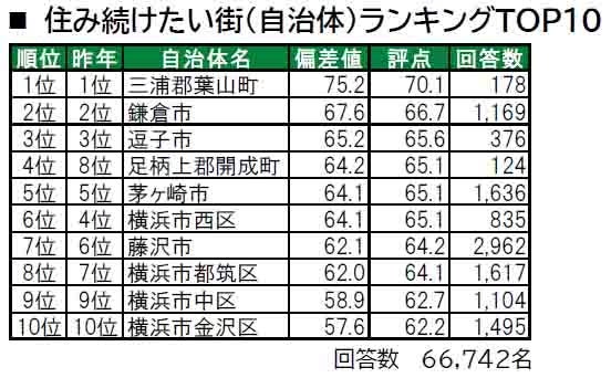 1位は、3年連続で唯一偏差値70台の三浦郡葉山町です。2位は逗子市で、昨年4位から順位を上げました。3位は、2年連続で横浜市青葉区です。トップ10内では、6位に昨年16位だった中郡大磯町、7位に初登場の足柄上郡山北町がランクインしています。7位の足柄上郡山北町は、昨年は累計回答数が50名未満でランキング集計対象外でした。