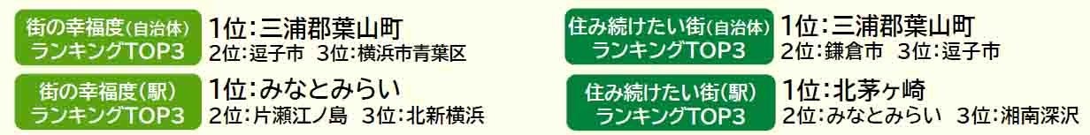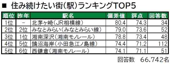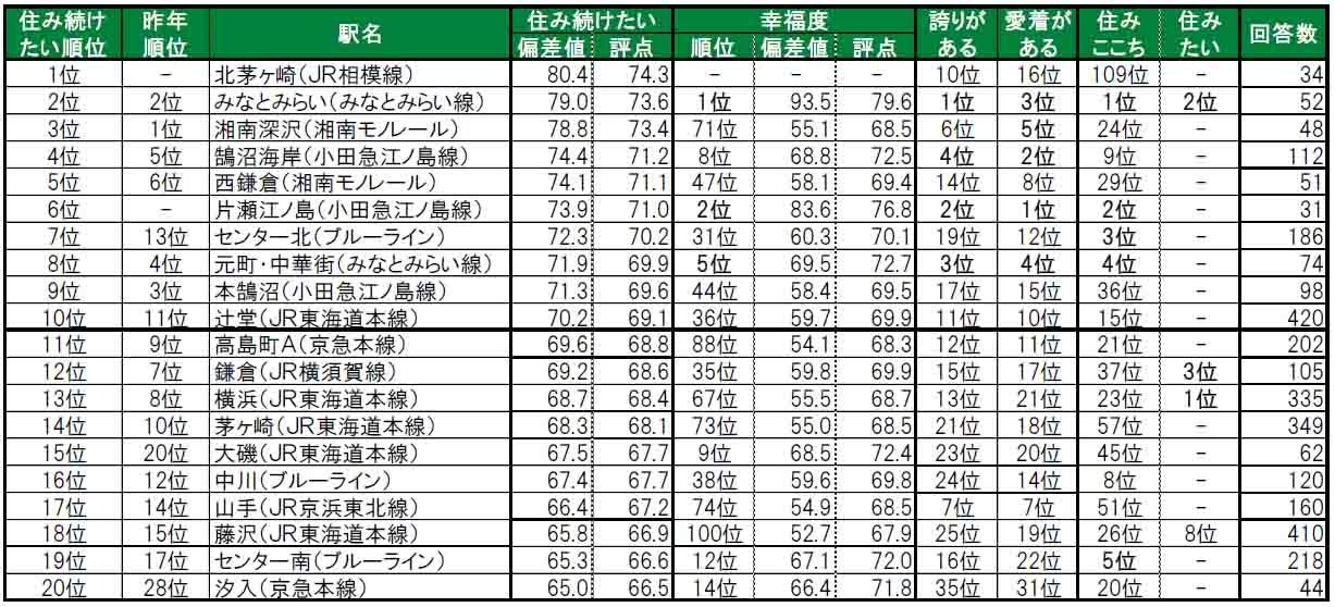 1位は初登場の茅ヶ崎市に位置する北茅ヶ崎で、昨年は累計回答数が30名未満でランキング集計対象外でした。2位は2年連続でみなとみらいで、「街の幸福度」では1位です。3位は、鎌倉市に位置する湘南深沢です。