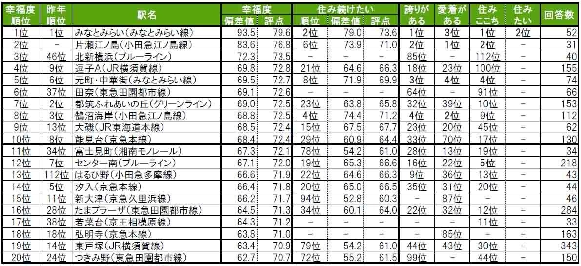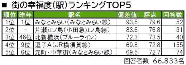 ■街の幸福度(駅)、トップは4年連続でみなとみらい、2位は初登場の片瀬江ノ島