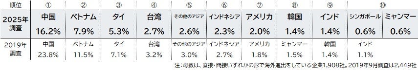 企業の海外進出率18.3% コロナ禍前より低下、 米国関税でさらに危機感 進出先トップの中国、近年は重要度が低下 ベトナムやインド、インドネシアの注目高まる