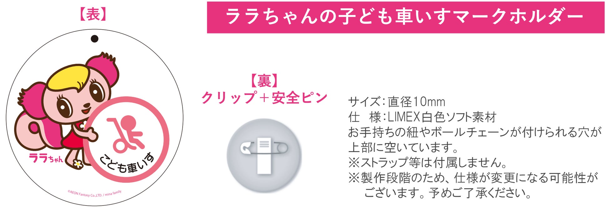 デザインにあたっては、「こども車いすマーク」の普及に努める「一般社団法人mina family」の活動に賛同し、ララちゃんが同法人の「こども車いすマーク」を大切に抱きしめ、車いすを押しているような温かいイラストを採用しました。