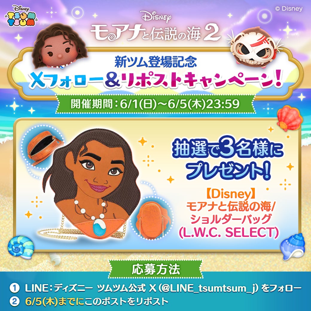 『モアナと伝説の海』の新ツム登場を記念して、『LINE:ディズニー ツムツム』公式 Xアカウントにて、抽選で3名様に「【Disney】モアナと伝説の海/ショルダーバッグ(L.W.C.SELECT)」が当たるX(旧Twitter)フォロー&リポストキャンペーンを実施中です。