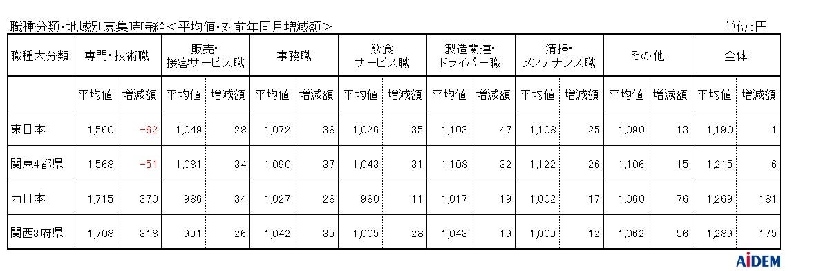 - 東日本エリア全体の平均時給は、前年同月比1円増の1,190円