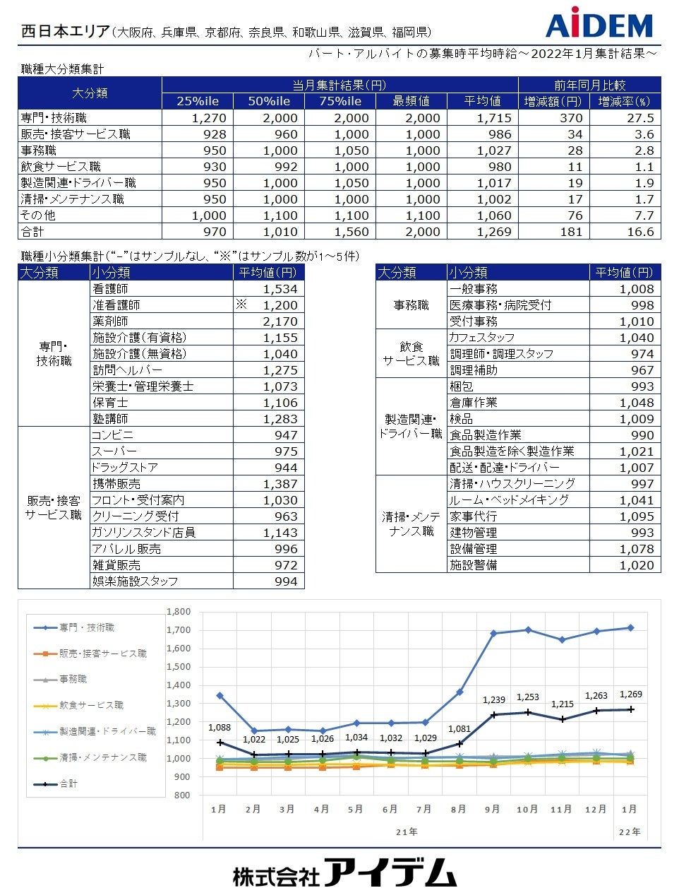 総合人材情報サービスの株式会社アイデム(本社:東京都新宿区 代表取締役社長:椛山 亮)は、求人メディア『イーアイデム』や採用ホームページ構築サービス『Jobギア採促』を利用して公表された求人情報から、2022年1月のパート・アルバイト募集時平均時給を集計いたしました。