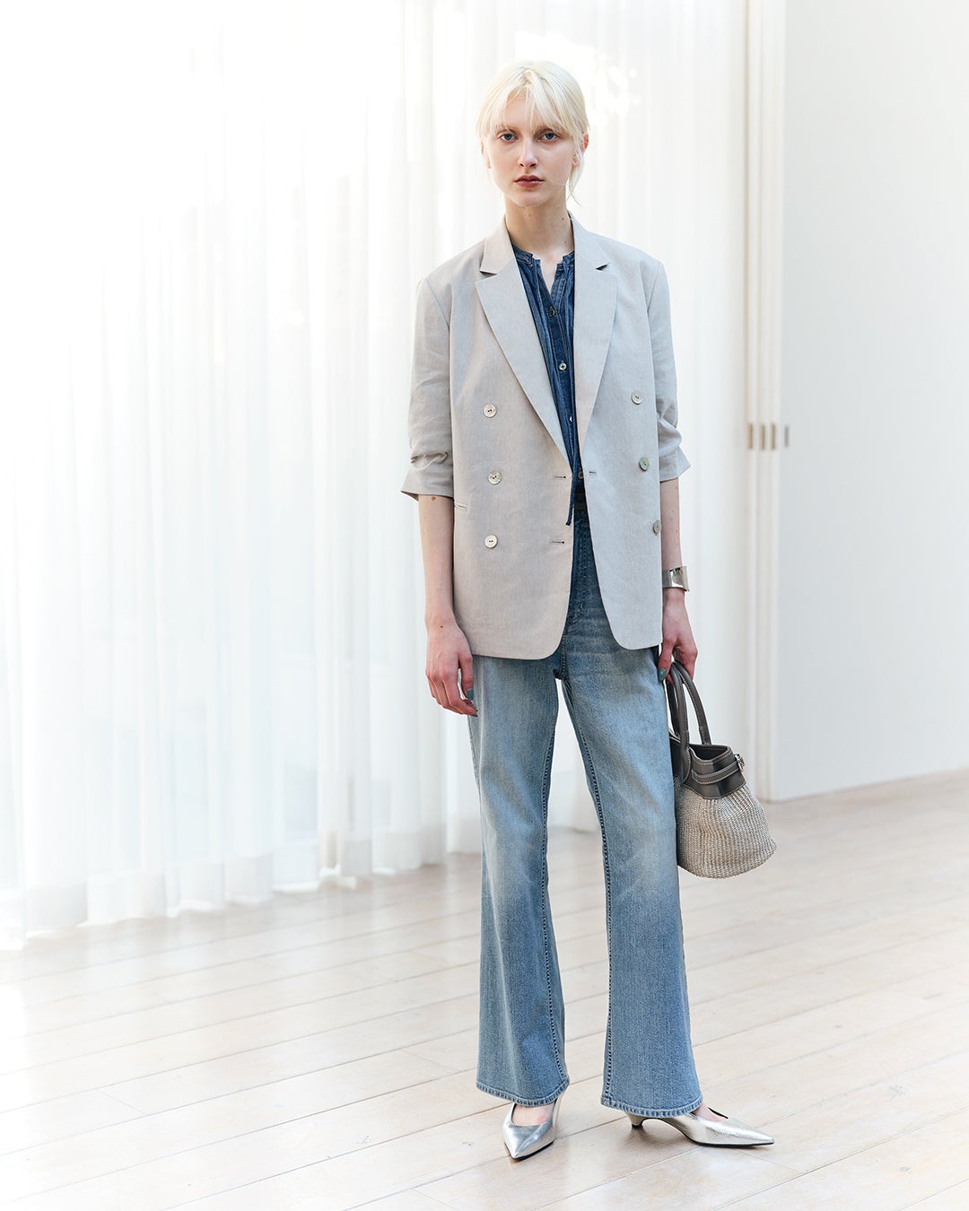 リネン特有のナチュラルな風合いに、上品な透け感と光沢感を纏ったオリジナルのオーガンジー。驚くほど軽やかでありながら、着映えのするハリ感を兼ね備えた素材は、全行程を愛知県で行っています。