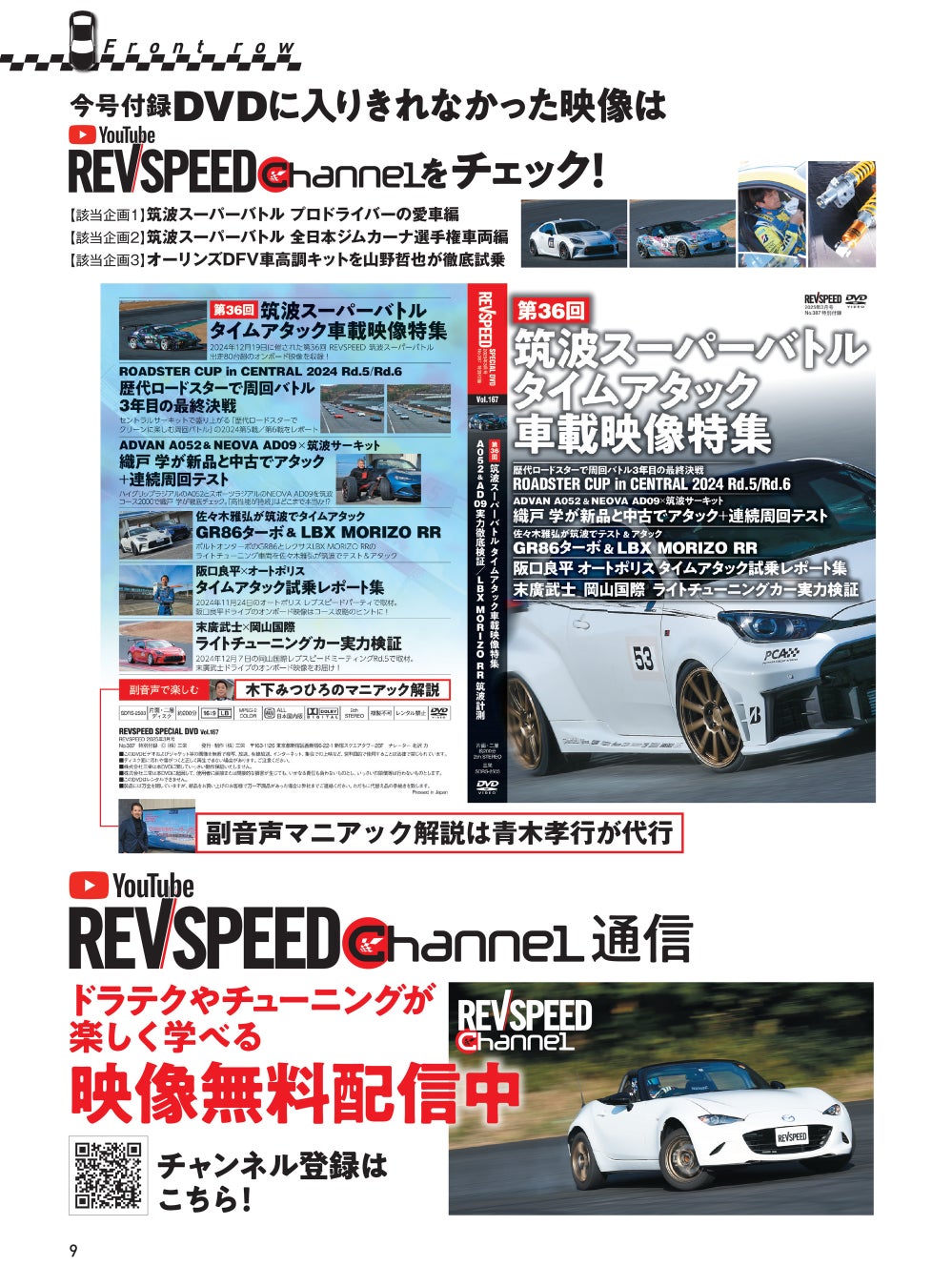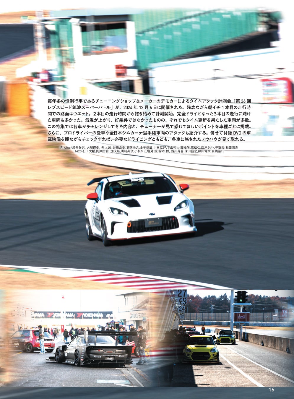 2024年12月の第36回 筑波スーパーバトルと2025年1月の東京オートサロンを特集。前者は出走81台の仕様内容と走行データにもとづく、それぞれの提案を大公開! 後者は会場で見つけた各社の最新チューニング情報をピックアップ! 付録DVDは2層203分の特盛り版。特集『第36回 筑波スーパーバトル』はプロドライバーのオンボード映像を満載してお届けしています! 『Roadster CUP in CENTRAL CIRCUIT 2024 Rd.5/Rd.6』『ADVAN A052とNEOVA AD09の高性能が長持ちはどこまで本当か? 織戸 学が筑波で徹底テスト』『ボルトオンターボGR86と早くもライトチューンのLEXUS LBX MORIZO RR 佐々木雅弘×筑波タイムアタック』『オートポリス レブスピードパーティ 阪口良平オンボード映像集』 『岡山国際レブスピードミーティング 末廣武士オンボード映像集』 も見応えタップリの構成となっています。木下みつひろの代役 青木孝行の副音声マニアック解説もお楽しみください。