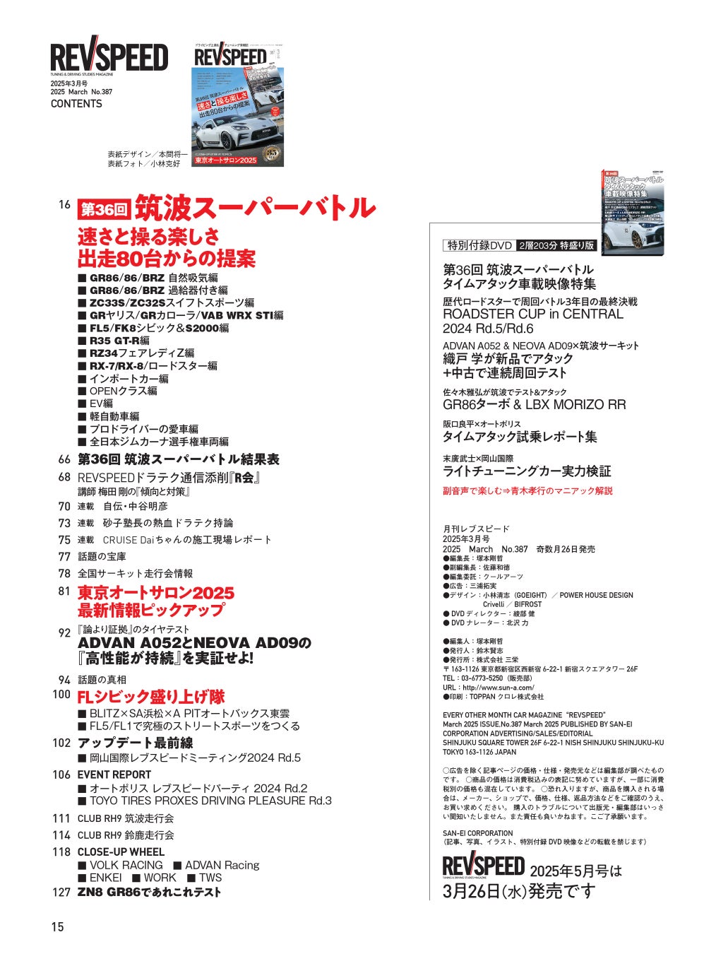 レブスピード3月号発売!誌面特集『第36回筑波スーパーバトル/東京オートサロン2025』。付録DVDは2層203分の特盛り版!『第36回筑波スーパーバトル』はプロドライバーのオンボード映像満載!