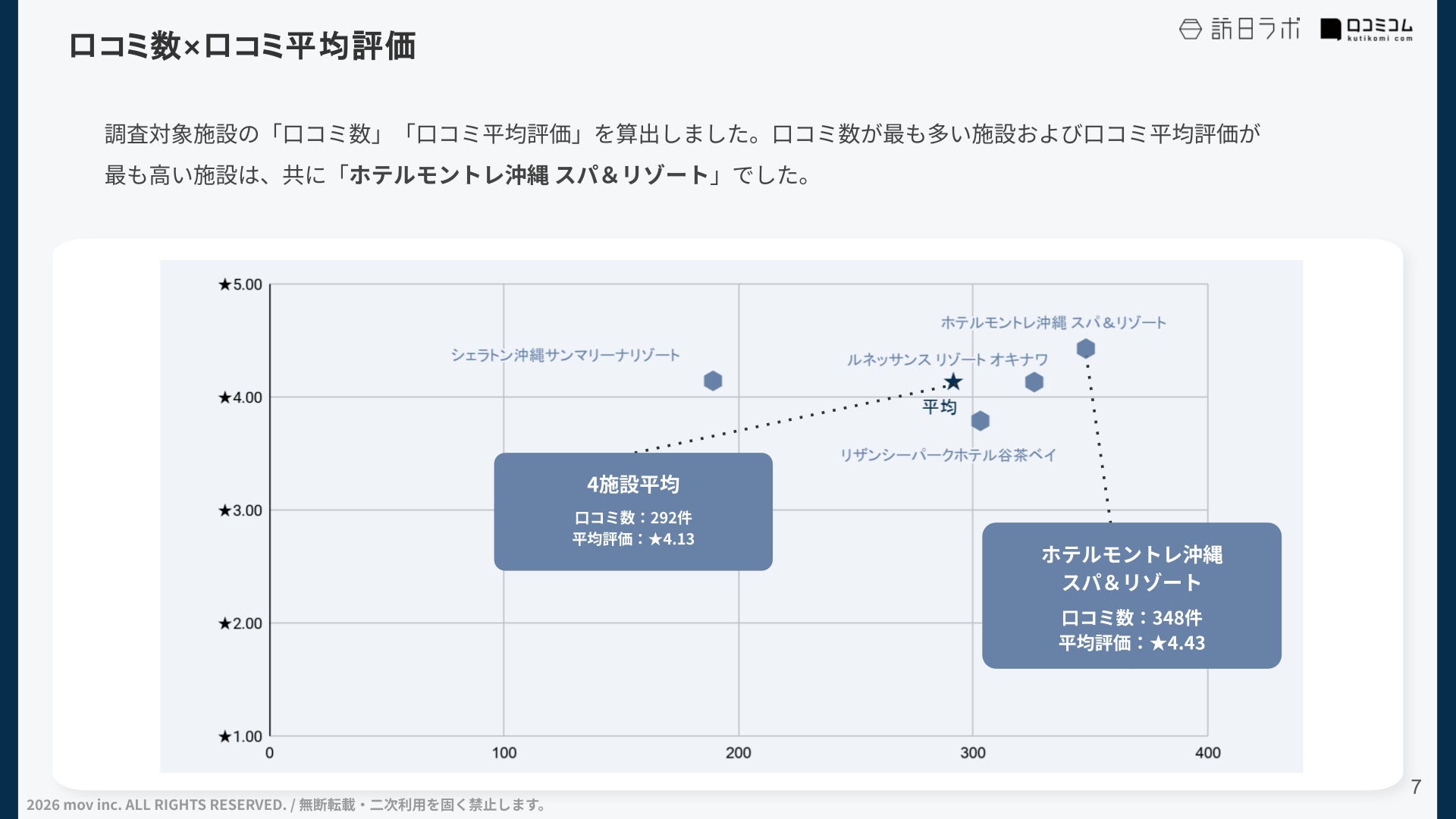 調査対象施設の「口コミ数」「口コミ平均評価」を算出しました。口コミ数が最も多い施設、口コミ平均評価が最も高い施設は、共に「ホテルモントレ沖縄 スパ&リゾート」でした。