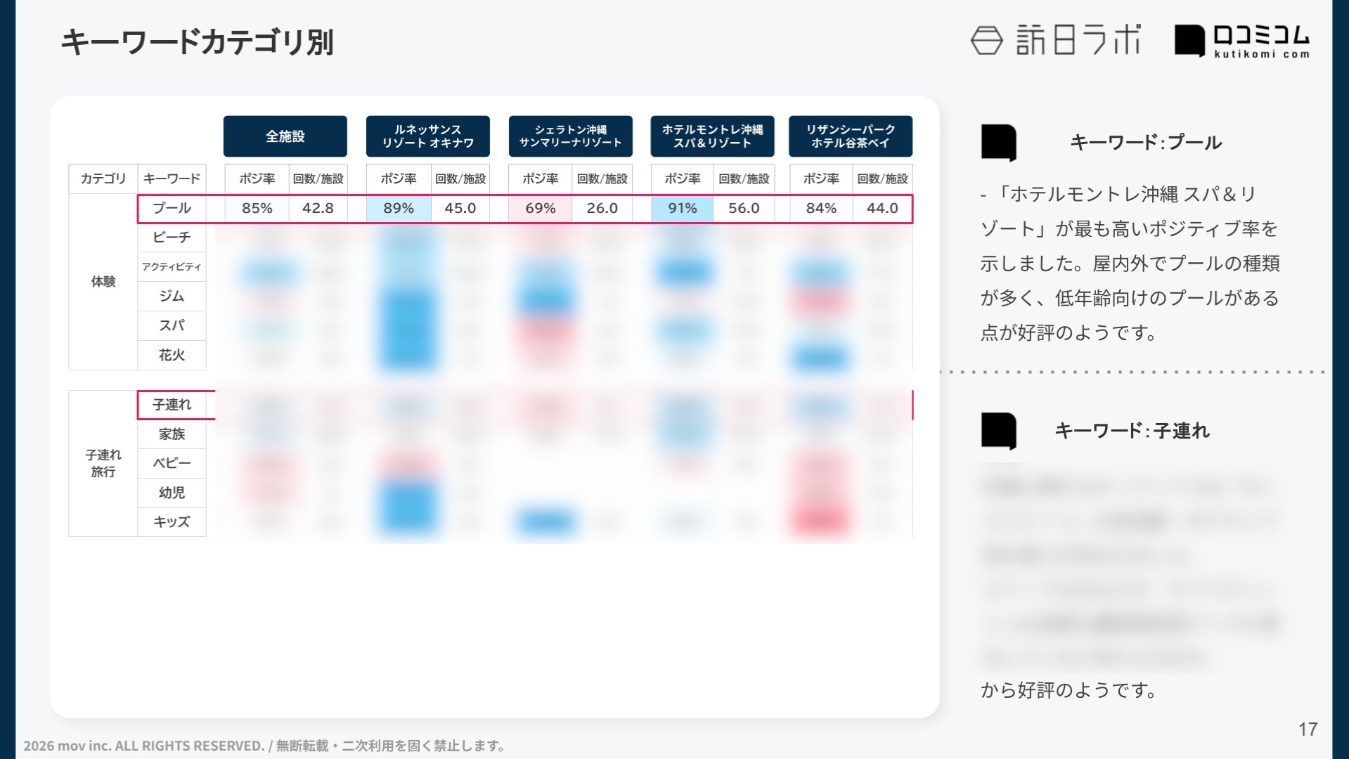 レポートでは他にも、とあるホテルの「子連れ」に関する口コミを分析し、ファミリー層に人気の理由を深堀りしています。