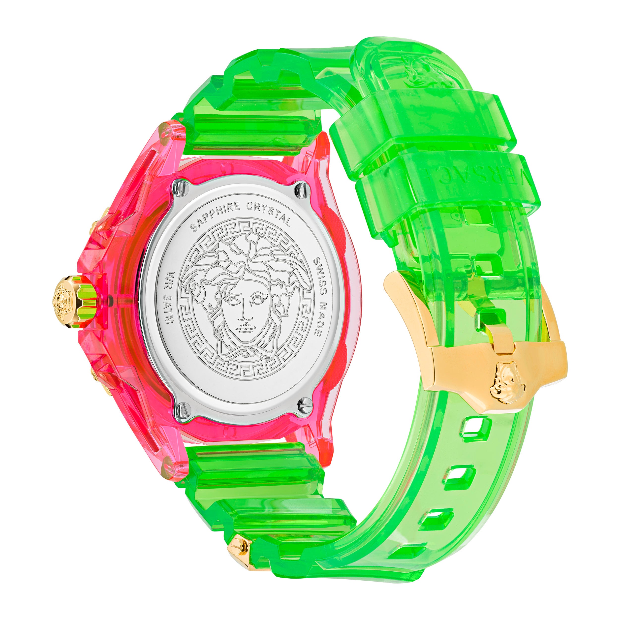 『ICON ACTIVE INDIGLO(アイコン アクティブ インディグロ)』は、4個のネジで留めたケージに収められた透明ポリカーボネート製ケースの腕時計コレクションです。ヴェルサーチェウォッチのベストセラーコレクションに、暗闇での視認性を高める「インディグロ®ナイトライト」を搭載。シースルーのストラップと大胆なカラーリングが、洗練された強い個性を放ちます。