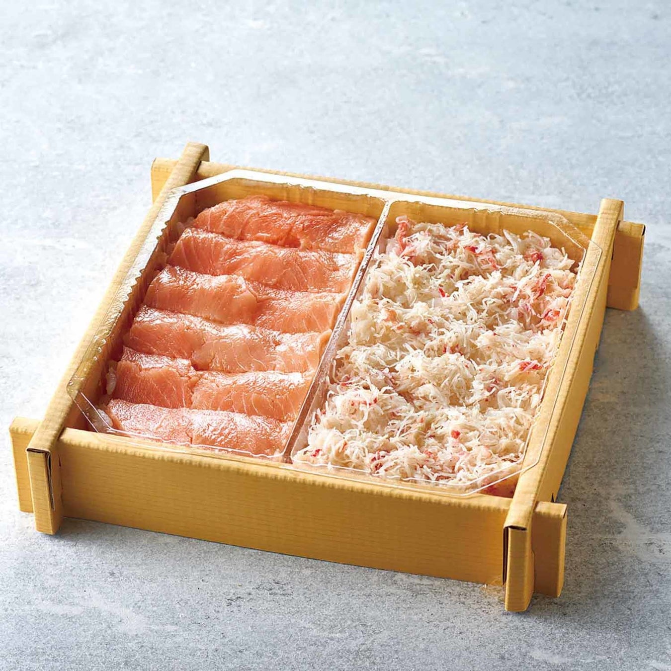 ズワイガニのむき身を使用した弁当。爪欠けなどで規格外となった素材を無駄なく利用。