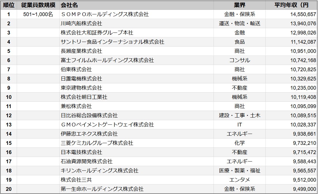 【2025年最新版】従業員数501~1,000名規模の上場企業 年収ランキングTOP20を発表/SalesNow DBレポート