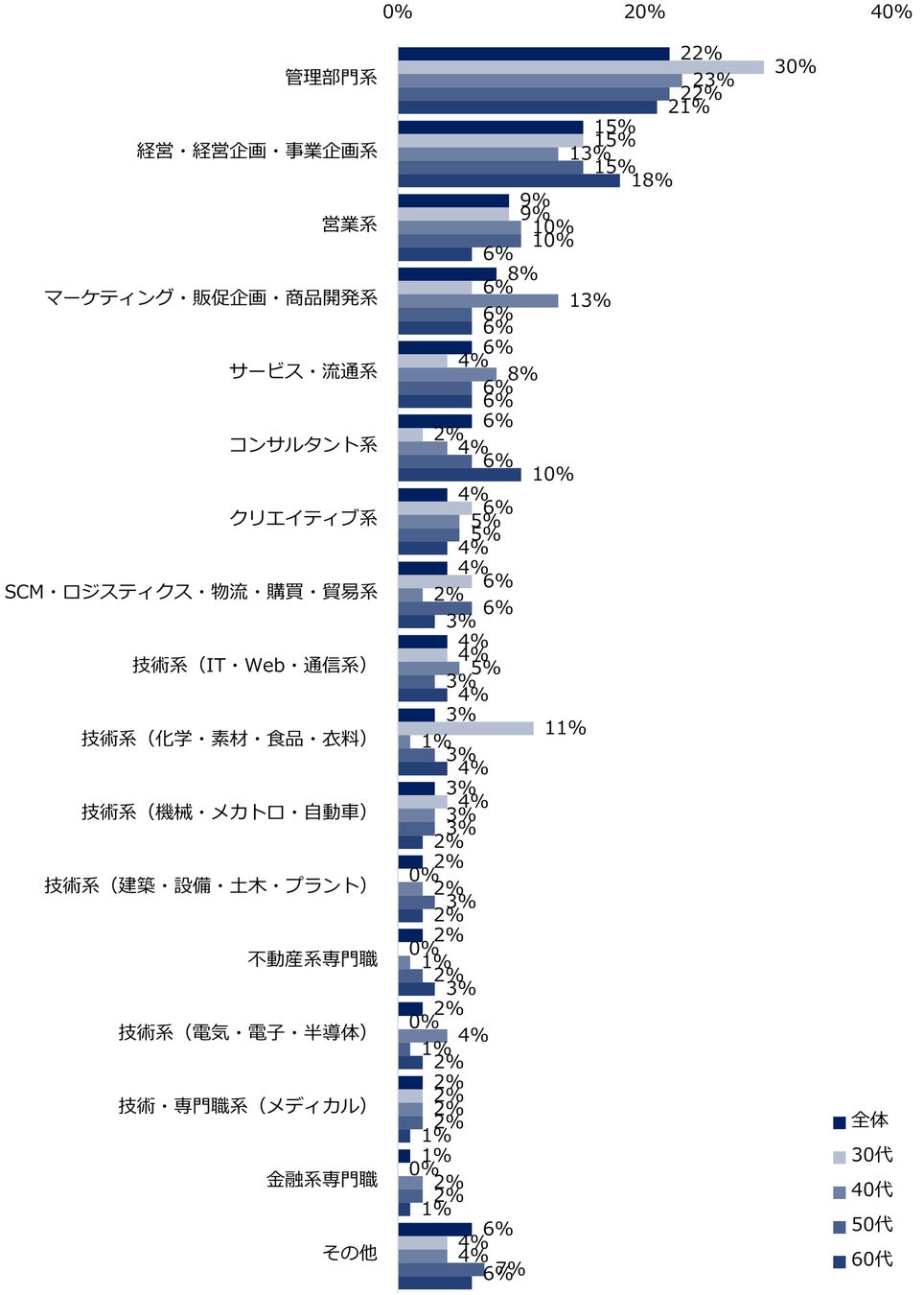 続けて興味を持っている”職種”を伺うと、上位は「管理部門系」(22%)、「経営・経営企画・事業企画系」(15%)でした。