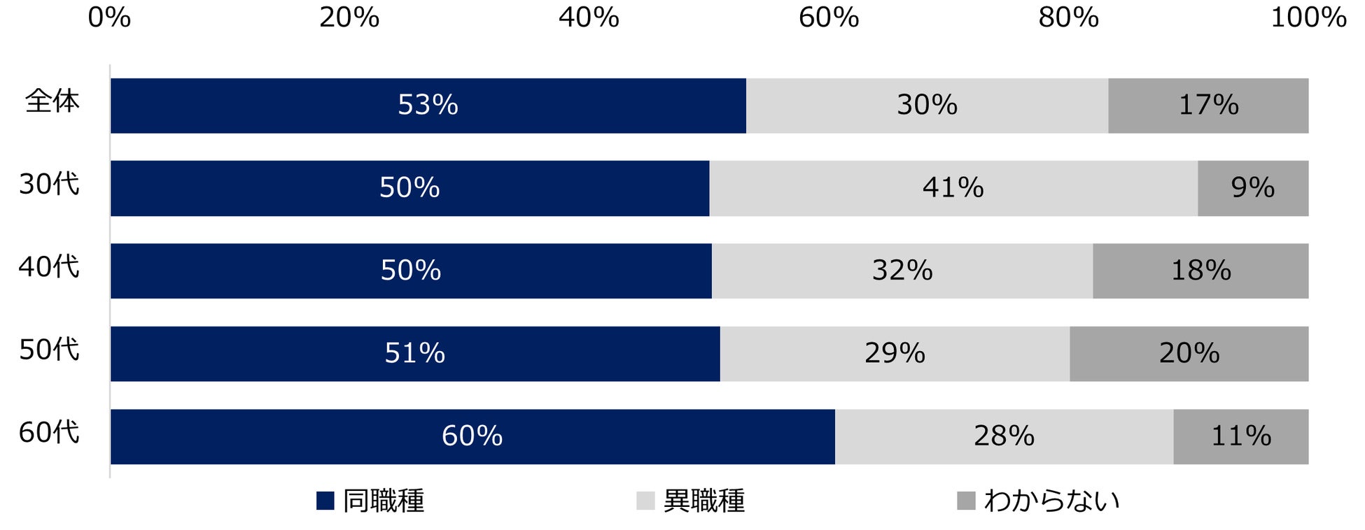 【図2】越境転職に興味があると回答した方に伺います。異業種に転職する場合、現在と同職種か、異職種への転職どちらを希望しますか?(年代別)