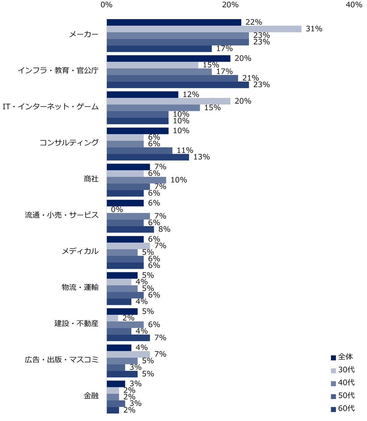 越境先の人気業種、最多は「メーカー」。次点の「インフラ・教育・官公庁」は年代が上がるほど関心が高まる結果に。