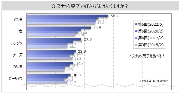 【スナック菓子に関する調査】スナック菓子を食べる人が好きな味は「うす塩」が約56%、「塩」が約45%、「コンソメ」「チーズ」「のり塩」「ガーリック」が各30%台
