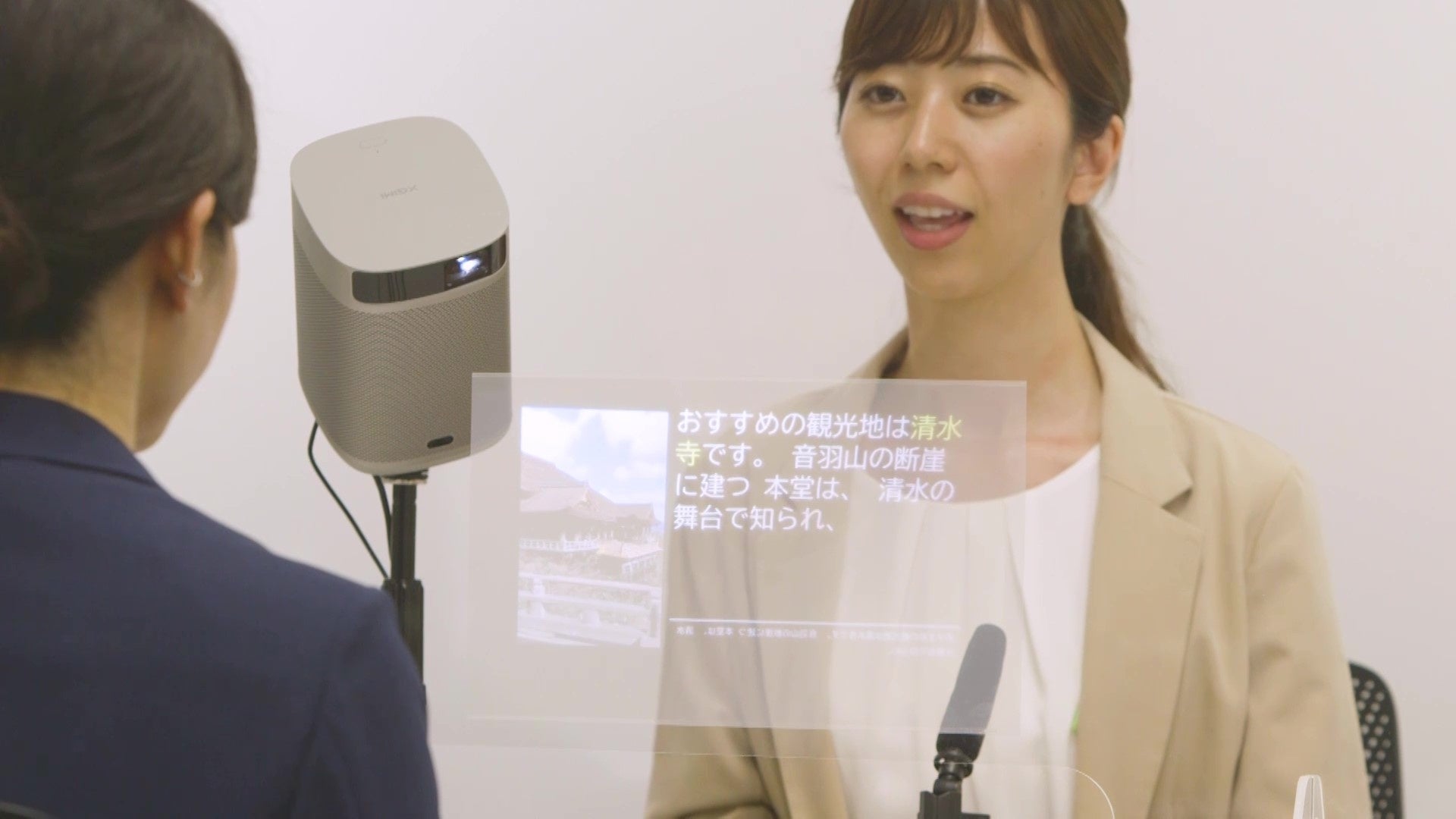 話した⾔葉をリアルタイムに認識して⽂字・図解・動画をスクリーンに表⽰することで、会話の聞き取りづらさを解消し、コミュニケーションを円滑にします。