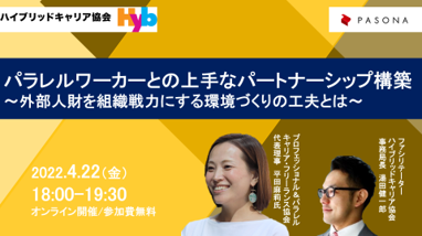 個人が主役となる多様な働き方を応援し、「個人自立社会」に向けた新たな社会インフラの構築を目指す「ハイブリッドキャリア協会」(運営主体:株式会社パソナ)は、第3回シンポジウム『パラレルワーカーとの上手なパートナーシップ構築 ~外部人財を組織戦力にする環境づくりの工夫とは~』を4月22日(金)にオンラインで開催いたします。