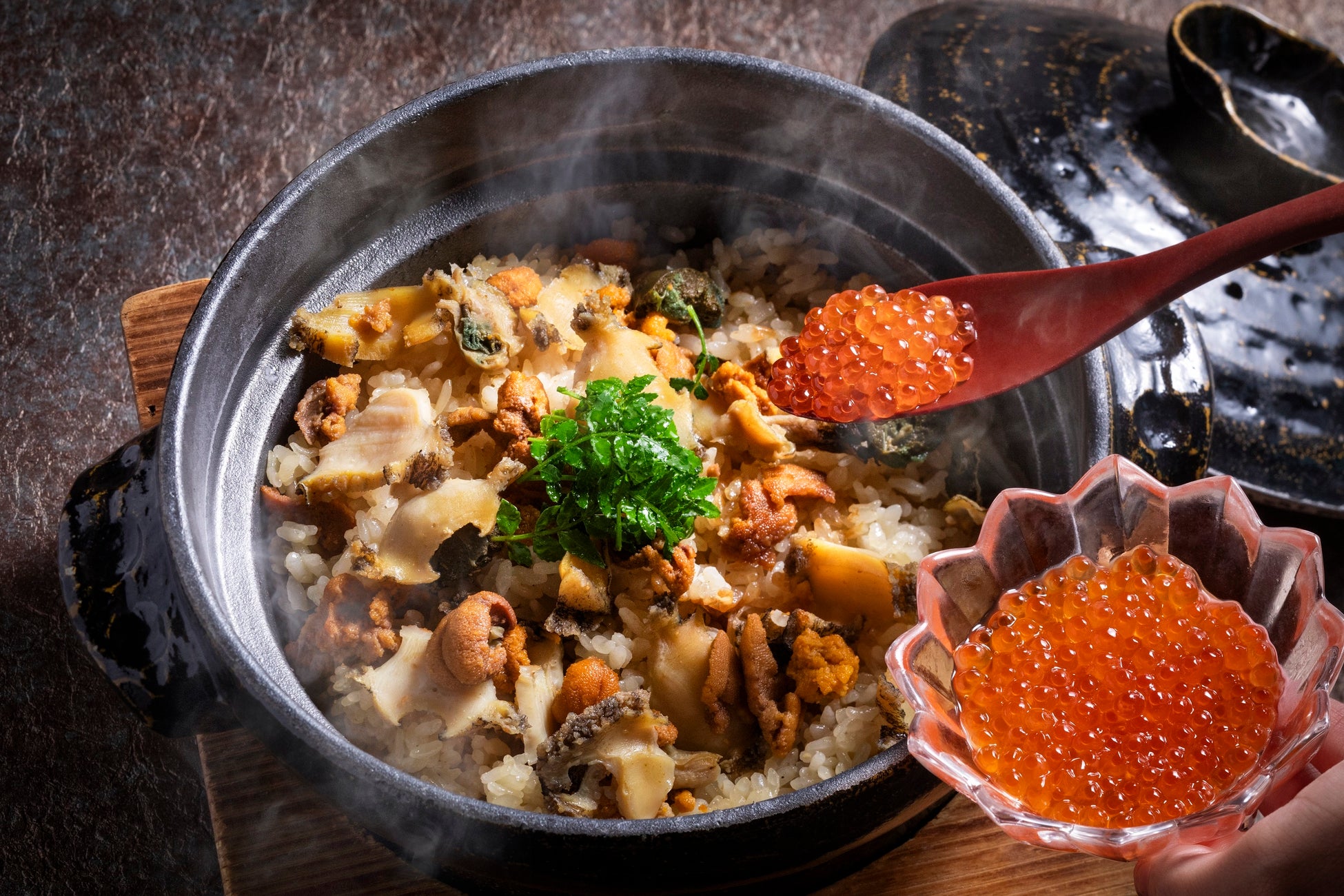 夕食ルームサービスとして、和食料理責任者特製の「雲丹と鮑の釜めしご飯」をルームサービスさせていただきます!ホカホカのゆめぴりか米に濃厚で肉厚な雲丹と鮑、さらに北海道らしくイクラをふんだんに使った自慢の一釜です。