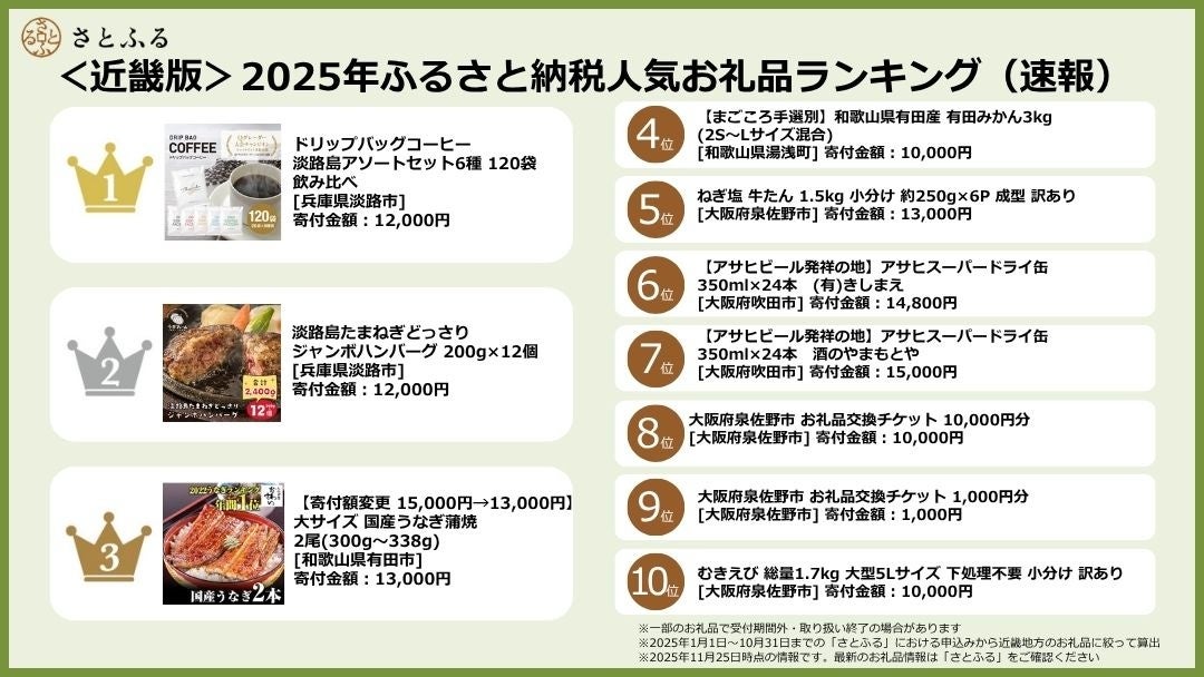 【さとふるニュースレター】<近畿版>2025年ふるさと納税人気お礼品ランキング(速報)