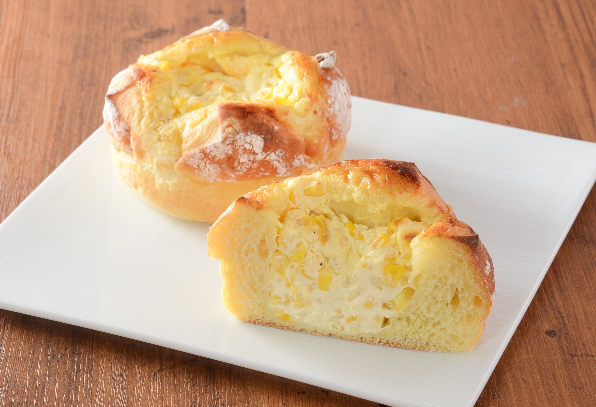 惣菜パンの人気メニュー「コーンマヨフィリング」をボリュームたっぷりに絞り、焼き上げました。